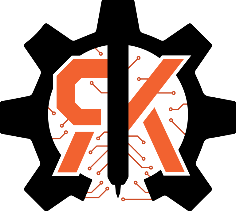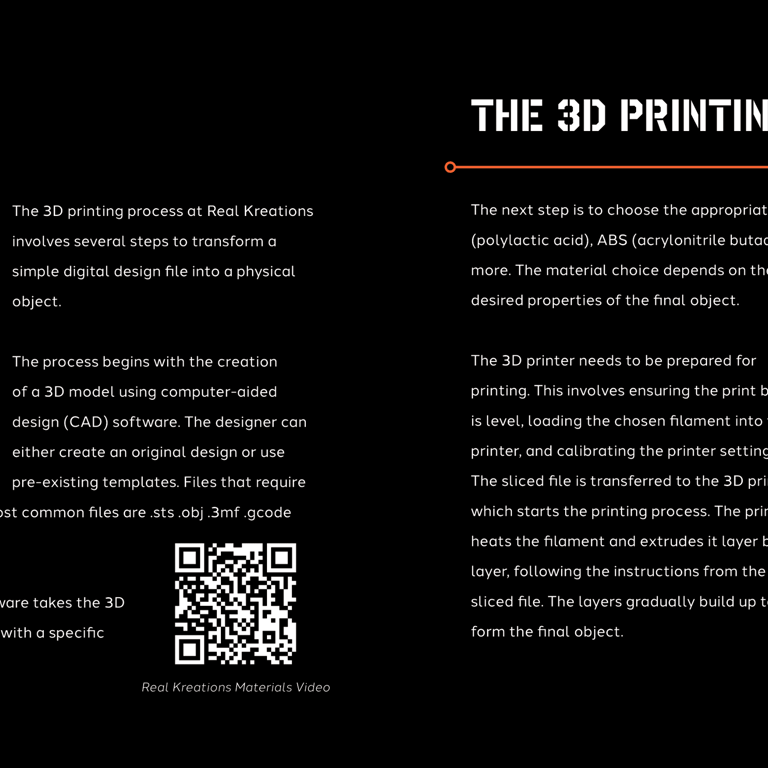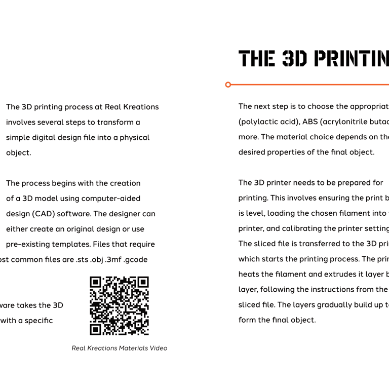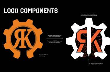 The original Real Kreations logo, featuring the letters "R" and "K" with a gear, was reimagined to embrace the 3D Printing aspect of the business by adding a nozzle between the letters. The design was simplified into a 2D graphic to ensure scalability without loss of detail while the circuitry was added to the negative space to highlight the company's technological innovation. The color palette was updated to a saturated orange and black.