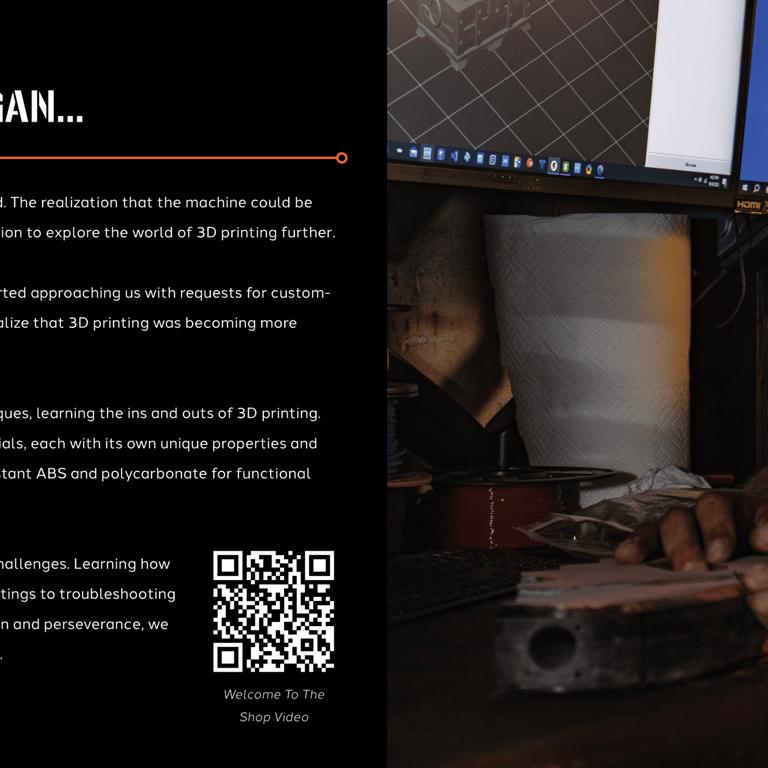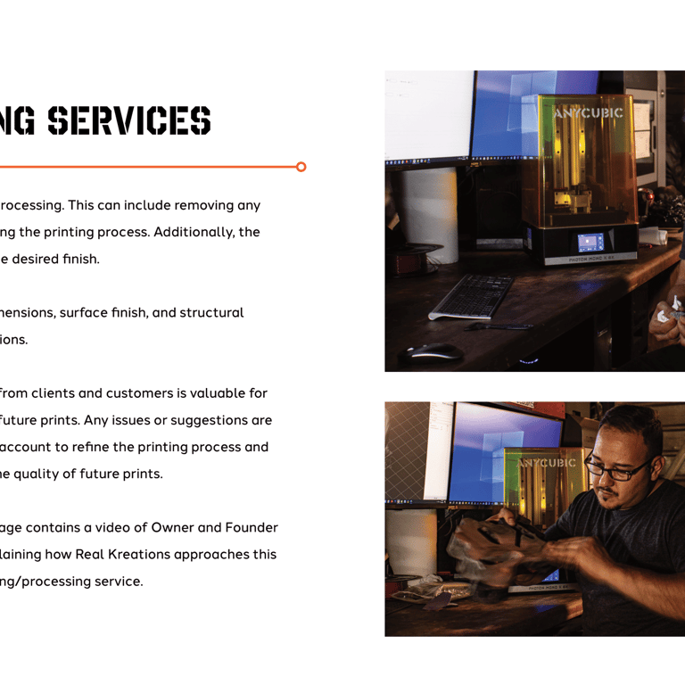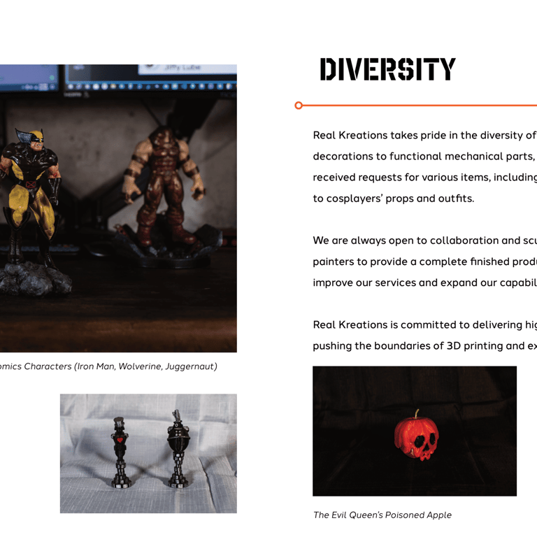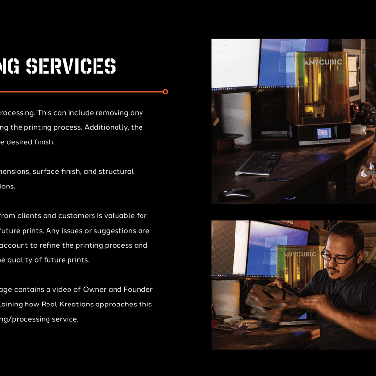 The remaining imagery and visuals involve the showcase of Real Kreations' Shop and Products as well as their Clientele. Photography includes images of their prints, their shop, and the owner. The Videography includes not only an interview with the owner but his process on approaching 3D Printing!